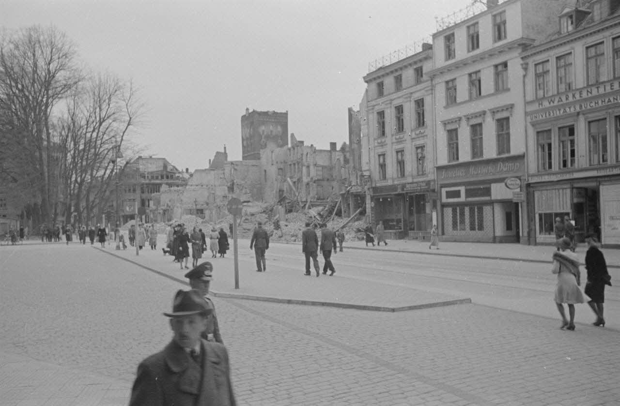 Des civils se promènent, des bâtiments en ruine tiennent encore, des boutiques : « Juwelier Hartwig Damp », « H. Warkentien , Universitats Buchhan ».