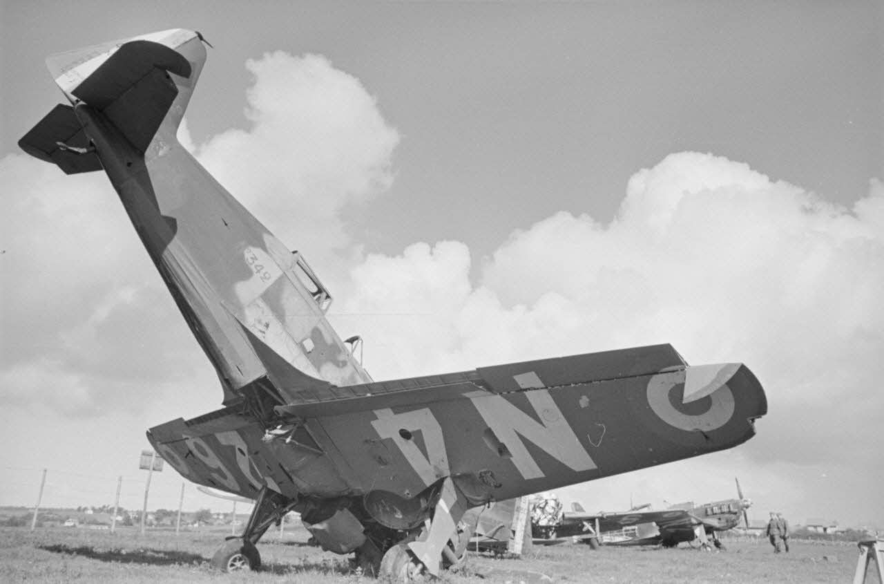 Le terrain d'aviation de Royan-Médis, les carcasses d'avions de chasse MS-406 et un canon de DCA (40 mm Bofors).