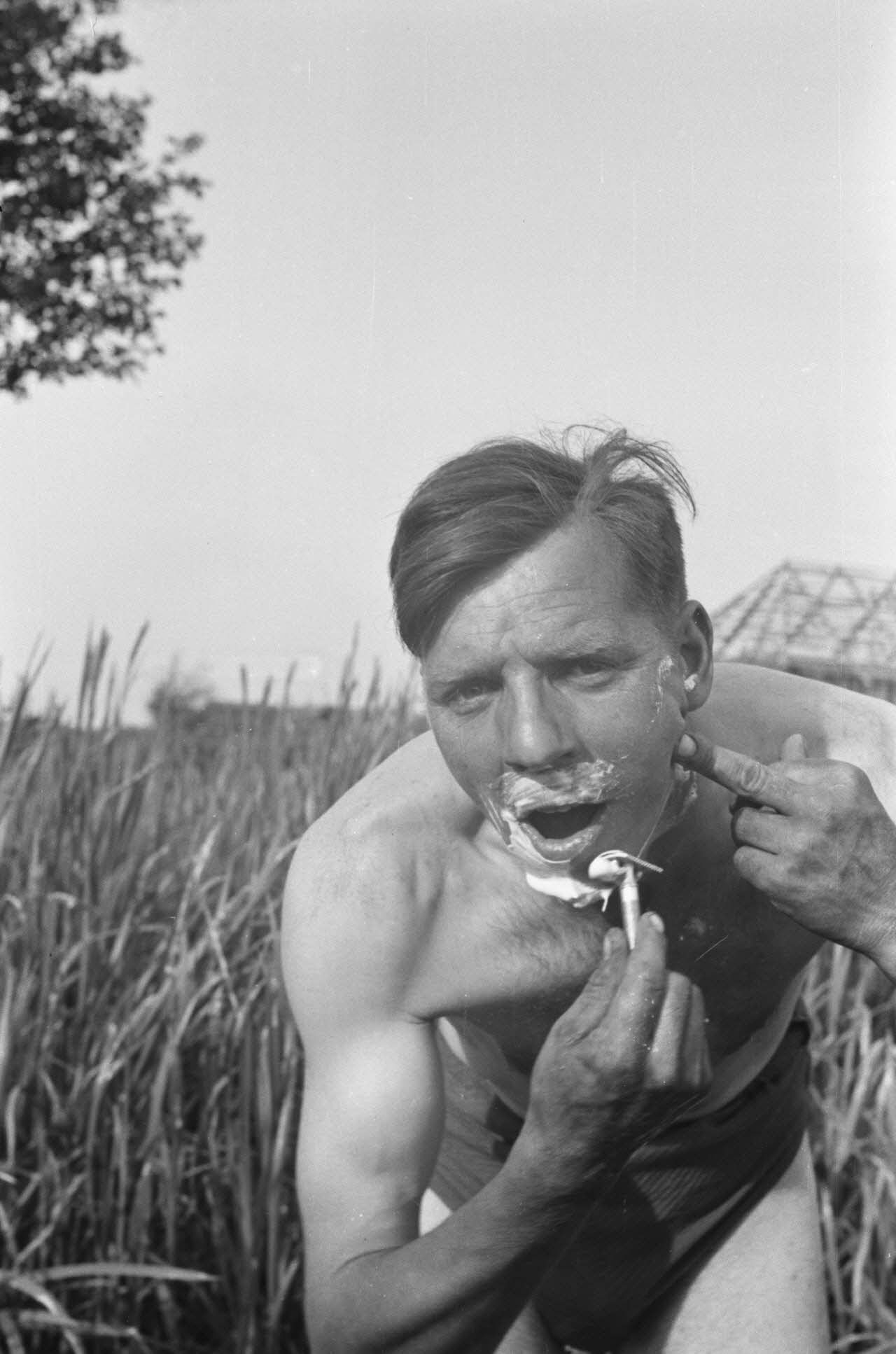 Des fantassins viennent de recevoir leur repas de midi et poursuivent l'avancée parallèlement à des camions Opel Blitz.