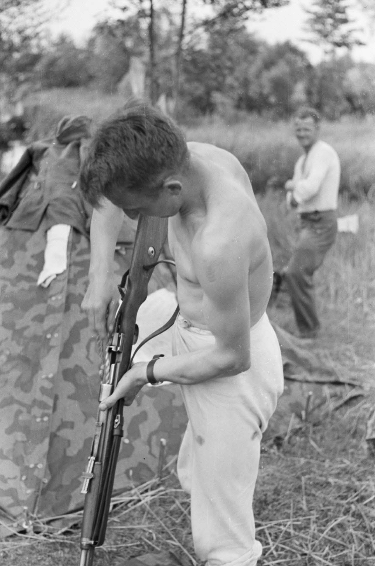 Un fantassin de la 137. infanterie division nettoie un fusil Mauser 98k.