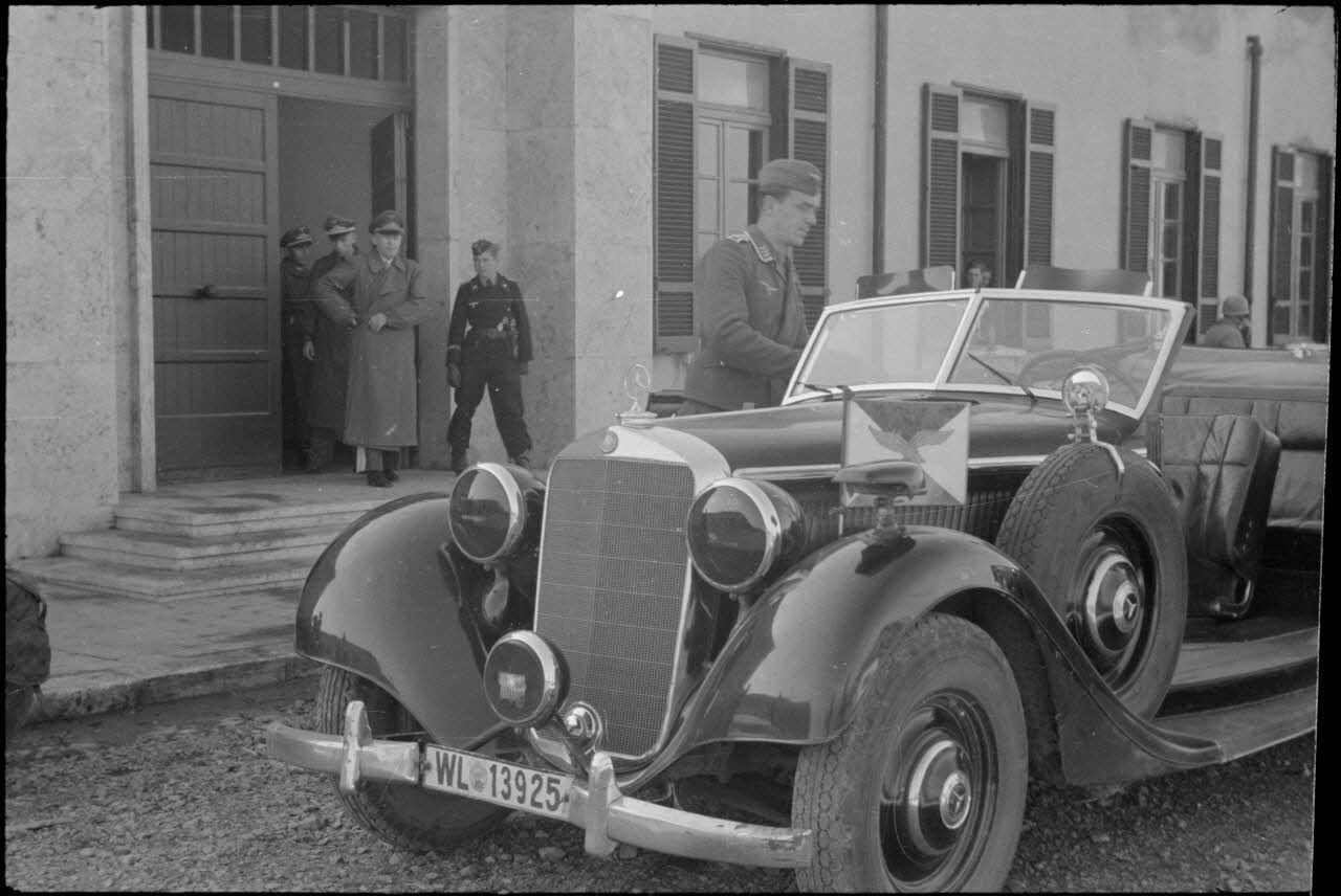 A bord de son cabriolet Mercedes, le général Kurt Student quitte la caserne occupée par le schwere Panzer Abteilung 508.