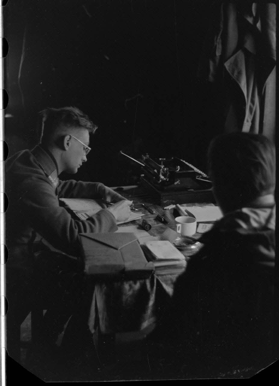 Durant la retraite allemande (Opération Büffelbewegung), dans le secteur de Wjasma (Viazma), le bureau d'un officier de la Luftwaffe improvisé dans une isba.