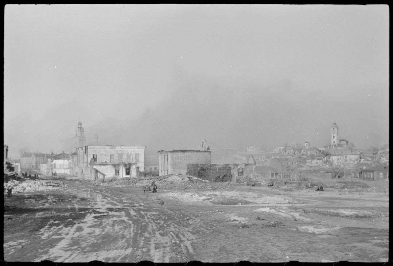 La ville Wjasma peu à avant le départ des troupes allemands, à l'arrière-plan la bibliothèque du front (Frontbuchhandlung).