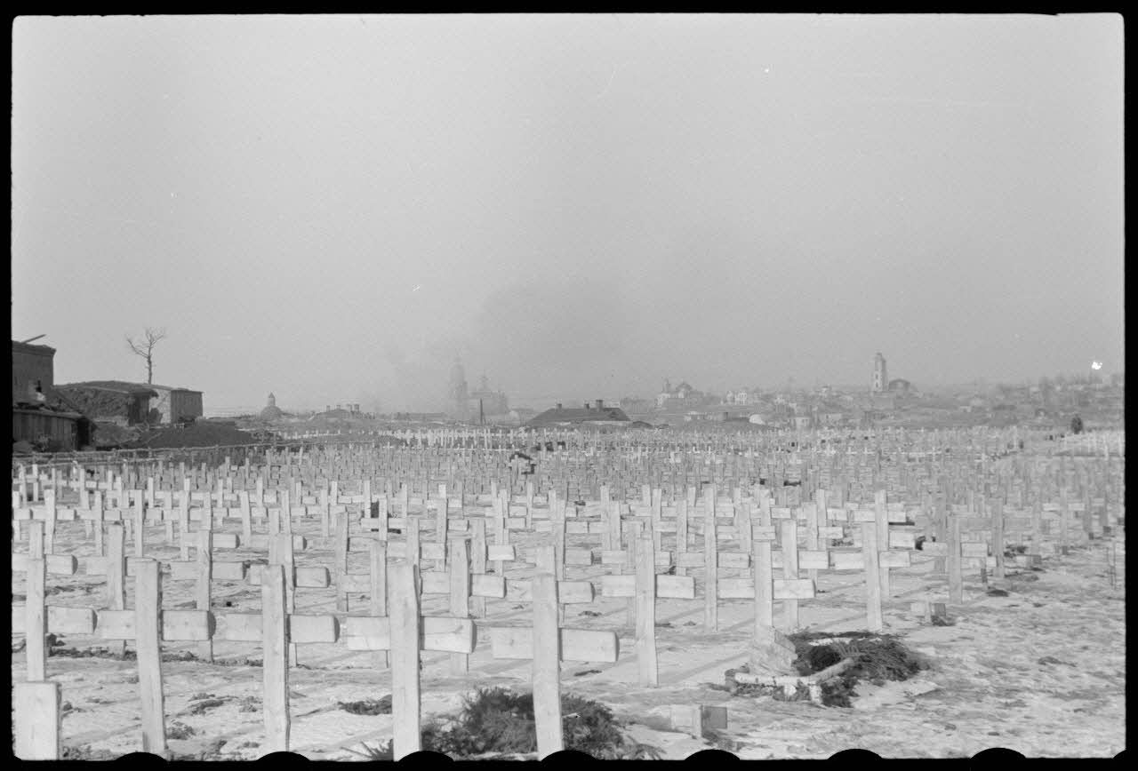Lors de l'opération Büffelbewegung, à Viazma (Wjasma), la retraite allemande à travers des villages soviétiques et un cimetière allemand à Wjasma.