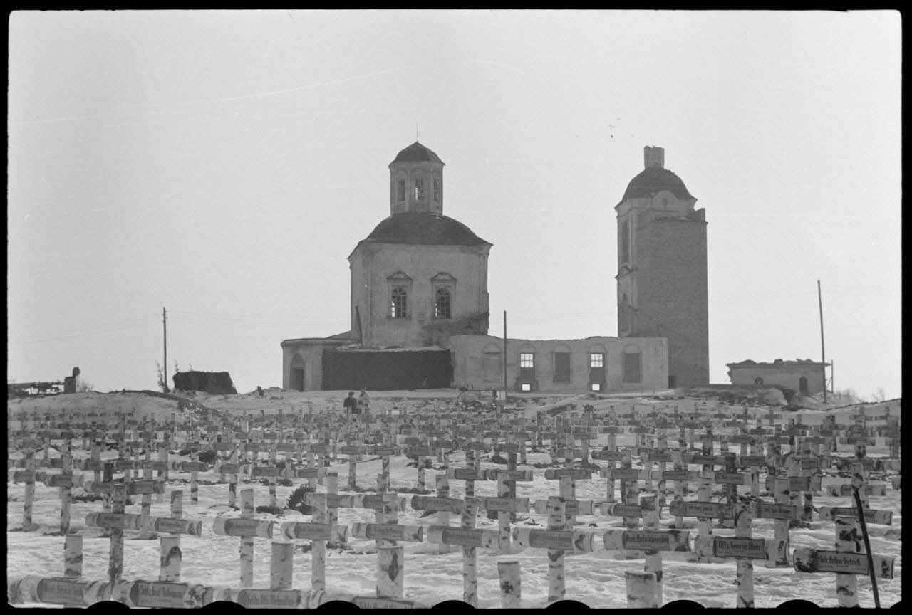 Lors de l'opération Büffelbewegung, à Viazma (Wjasma), la retraite allemande à travers des villages soviétiques et un cimetière allemand à Wjasma.