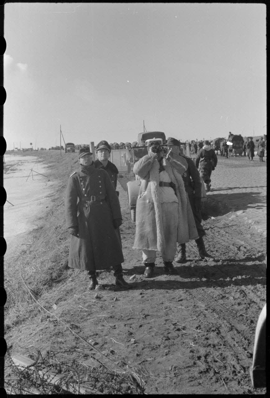 Le général Job Odebrecht, commandant du second corps de DCA allemand (Kommandierender General des 2.Flakkorps) observe une attaque aérienne.