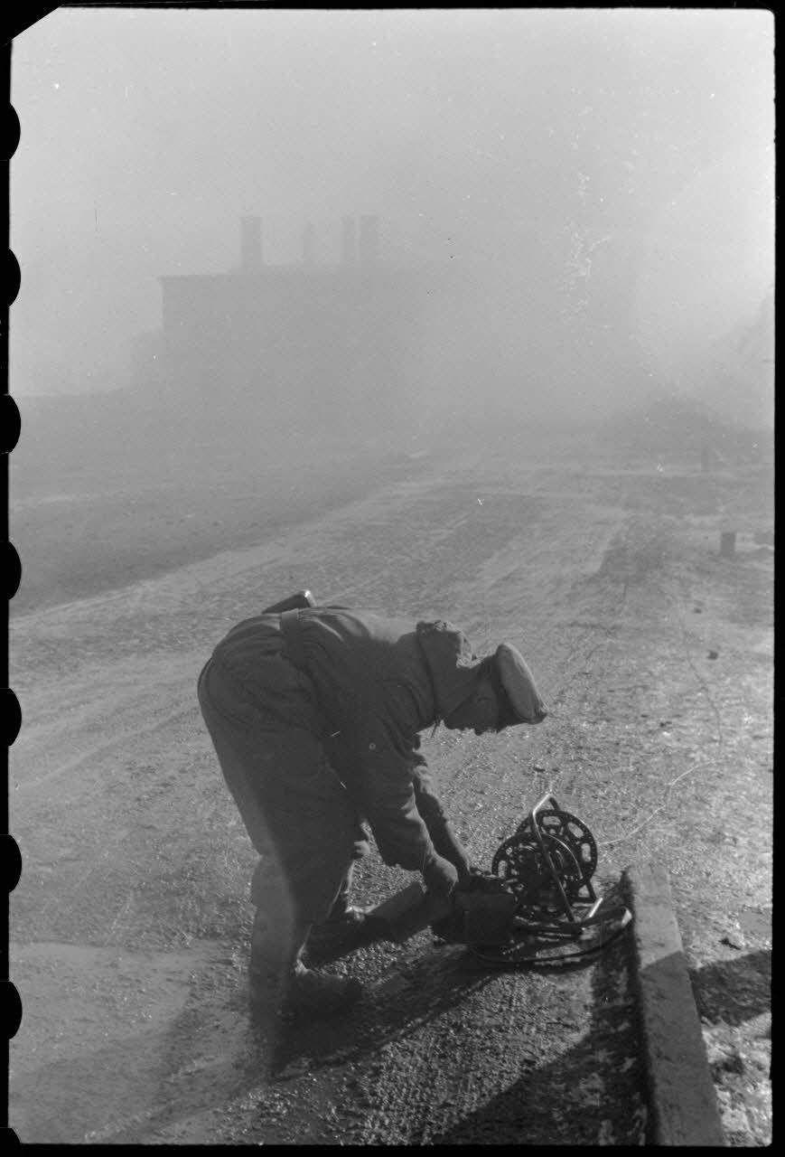 Peu avant le départ des troupes allemandes de Wjasma, un officier du Génie prépare la destruction d'un pont à l'aide d'explosifs.