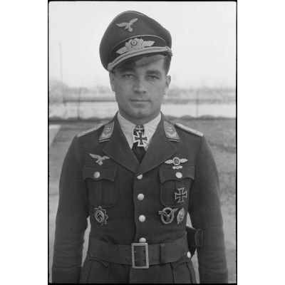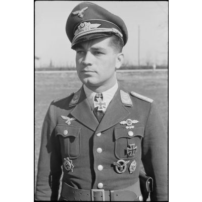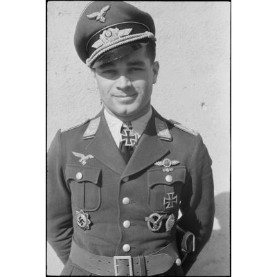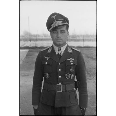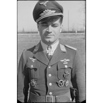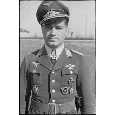 Portrait du lieutenant (Oberleutnant) Georg Sattler pilote du 1.(K)/LG.1 à Aviano (Frioul, Italie).