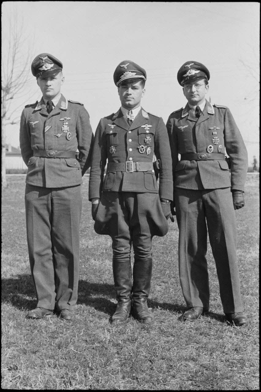 Portrait du lieutenant (Oberleutnant) Georg Sattler et de son équipage membres du 1.(K)/LG.1 à Aviano (Frioul, Italie).