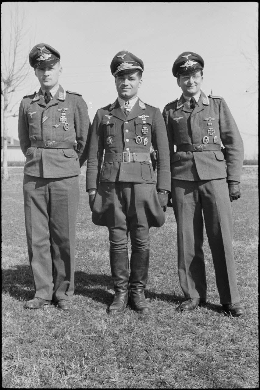 Portrait du lieutenant (Oberleutnant) Georg Sattler et de son équipage membres du 1.(K)/LG.1 à Aviano (Frioul, Italie).
