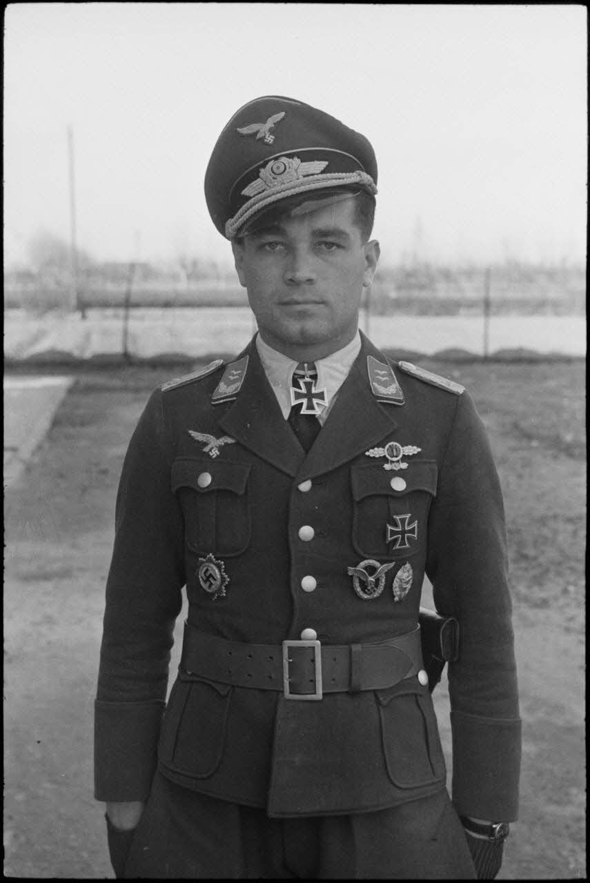 Portrait du lieutenant (Oberleutnant) Georg Sattler pilote du 1.(K)/LG.1 à Aviano (Frioul, Italie).