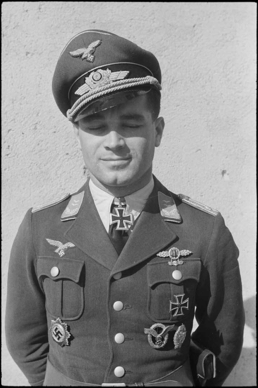 Portrait du lieutenant (Oberleutnant) Georg Sattler pilote du 1.(K)/LG.1 à Aviano (Frioul, Italie).