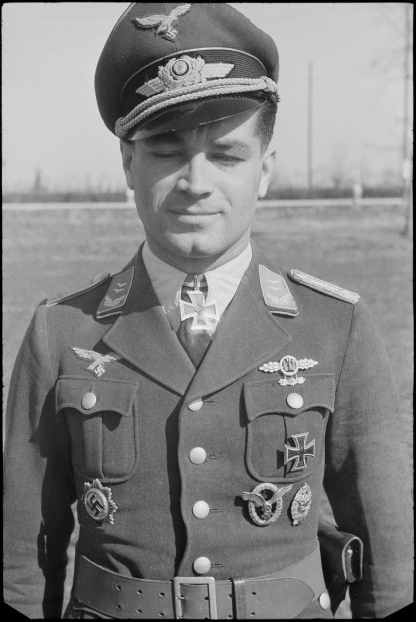 Portrait du lieutenant (Oberleutnant) Georg Sattler pilote du 1.(K)/LG.1 à Aviano (Frioul, Italie).