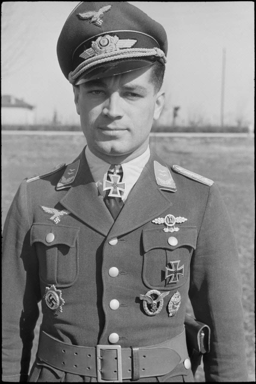 Portrait du lieutenant (Oberleutnant) Georg Sattler pilote du 1.(K)/LG.1 à Aviano (Frioul, Italie).