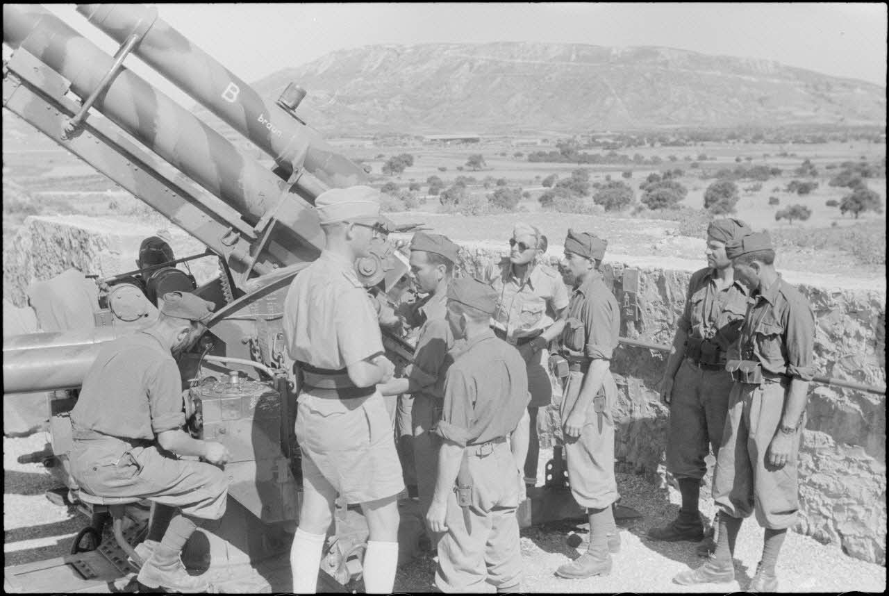 Sur l'île de Rhodes, des artilleurs allemands forment leurs homologues italiens au maniement du canon 8,8 cm Flak.