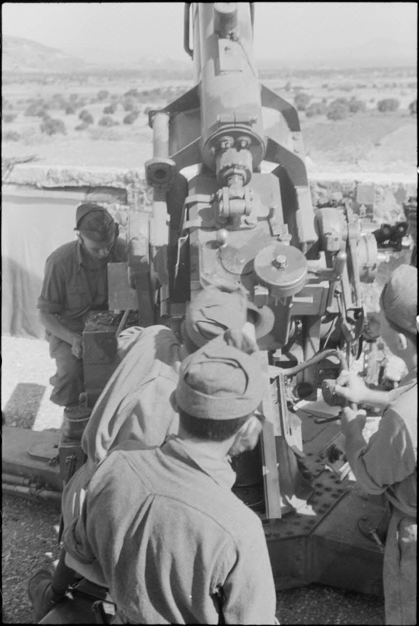 Instruction d'une équipe de direction de tir de l'armée italienne sur un télémètre (Entfernungmesser 4mRH ou Kommandogerät) servant de guide au tir d'une batterie de 8,8 cm FlaK.