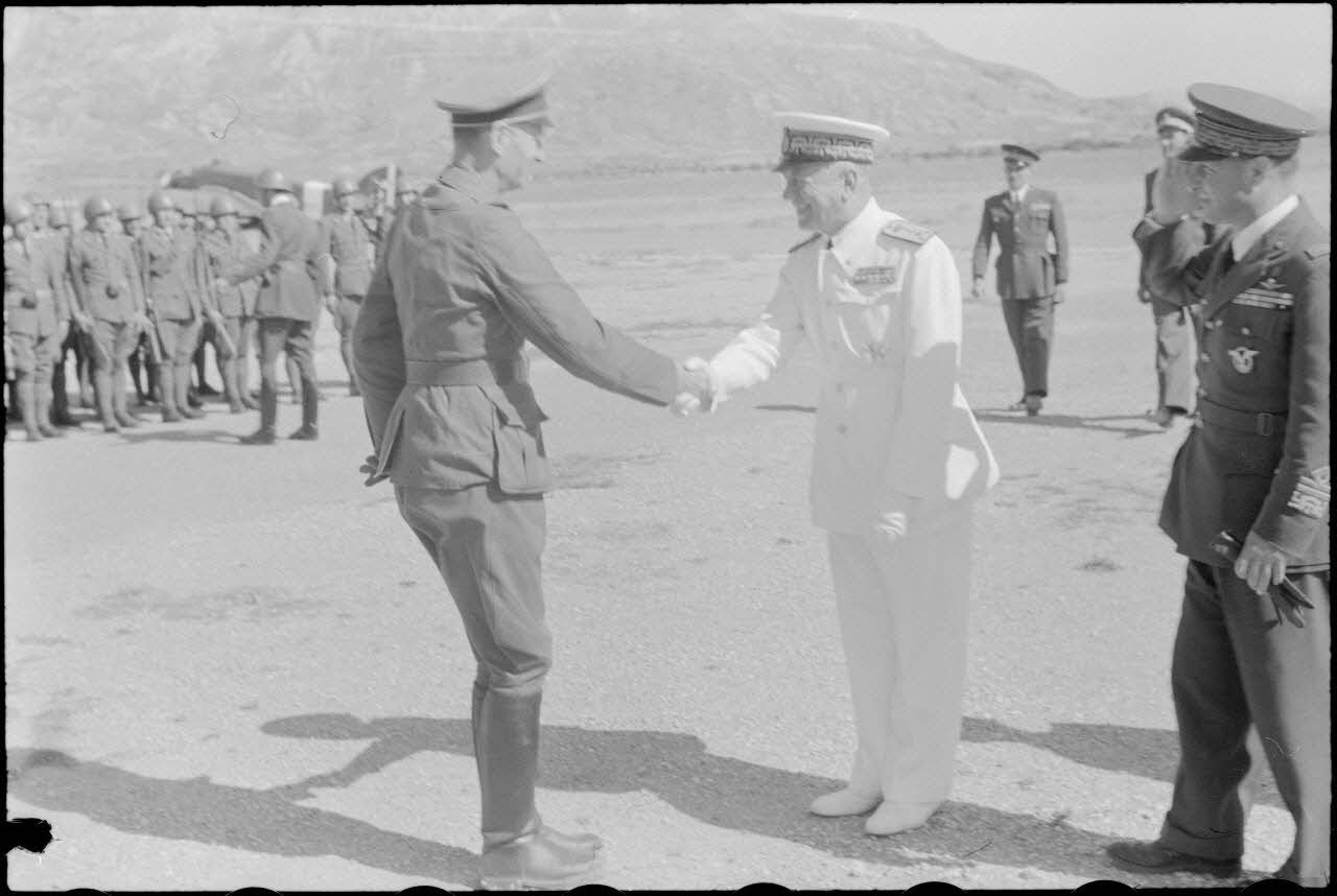 L'amiral italien Inigo Campioni guide son invité le général Martin Fiebig lors de son inspection des positions allemandes du Mont Filérimos.<br>