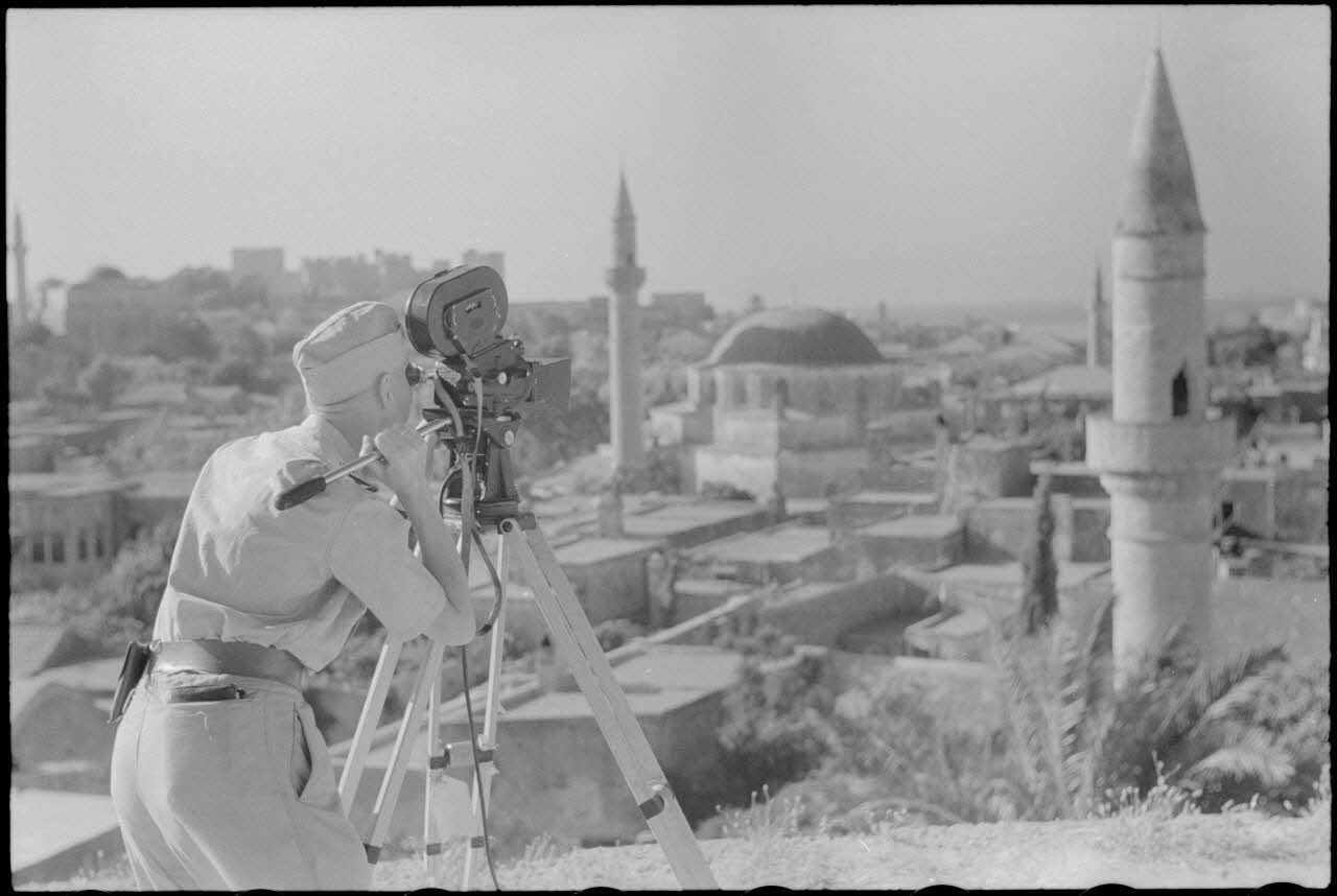 Le caméraman Hermann Dressler filme la ville de Rhodes à l'aide d'une Arriflex.