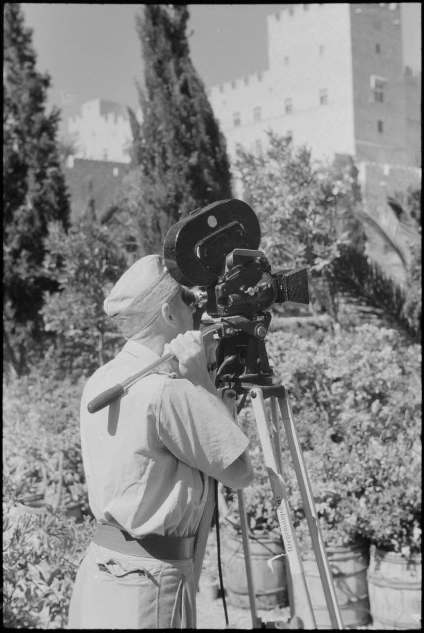 Le caméraman Hermann Dressler filme la ville de Rhodes à l'aide d'une Arriflex.