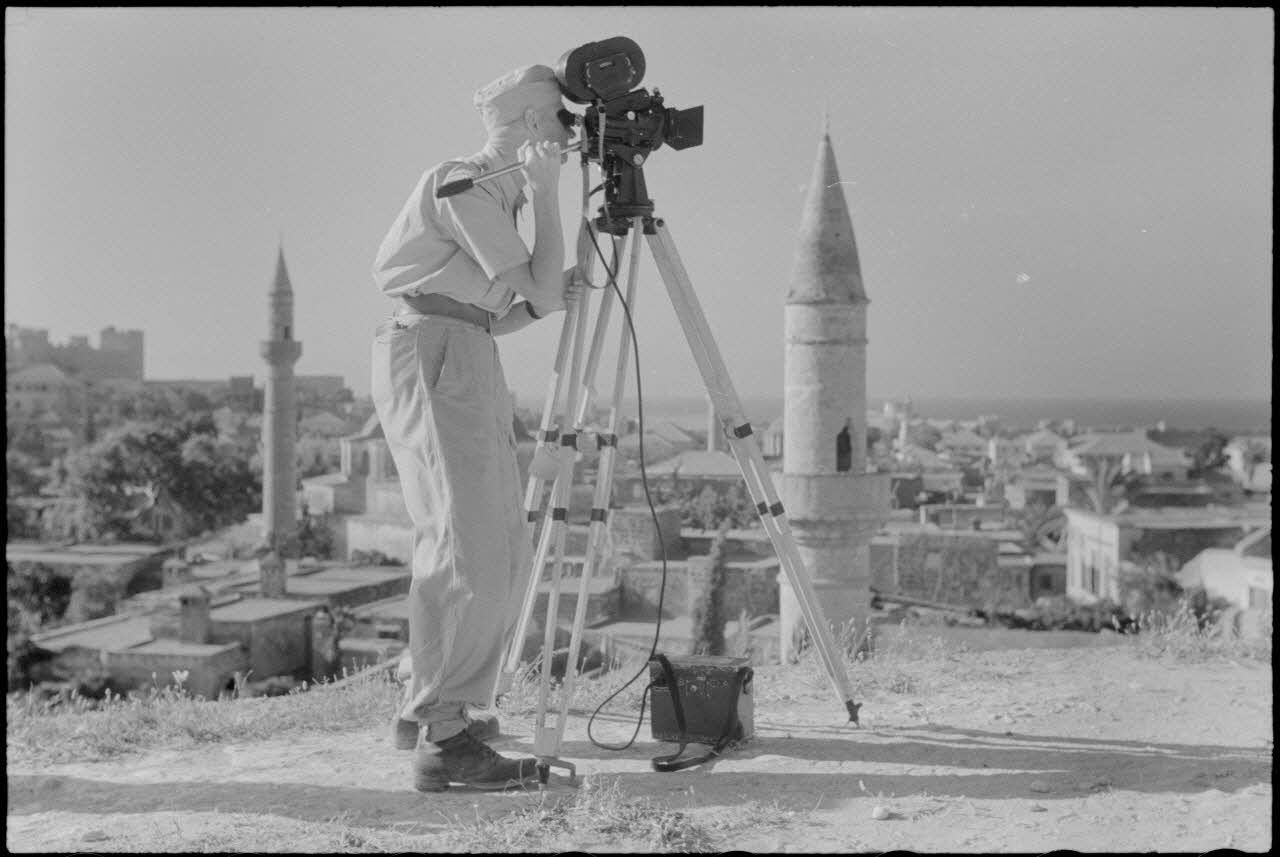 Le caméraman Hermann Dressler filme la ville de Rhodes à l'aide d'une Arriflex.