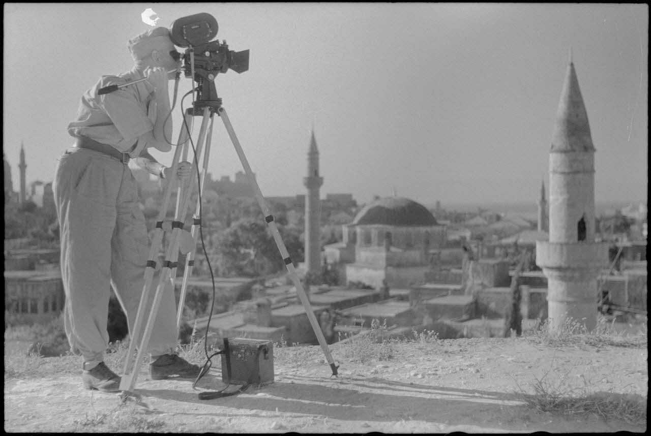 Le caméraman Hermann Dressler filme la ville de Rhodes à l'aide d'une Arriflex.