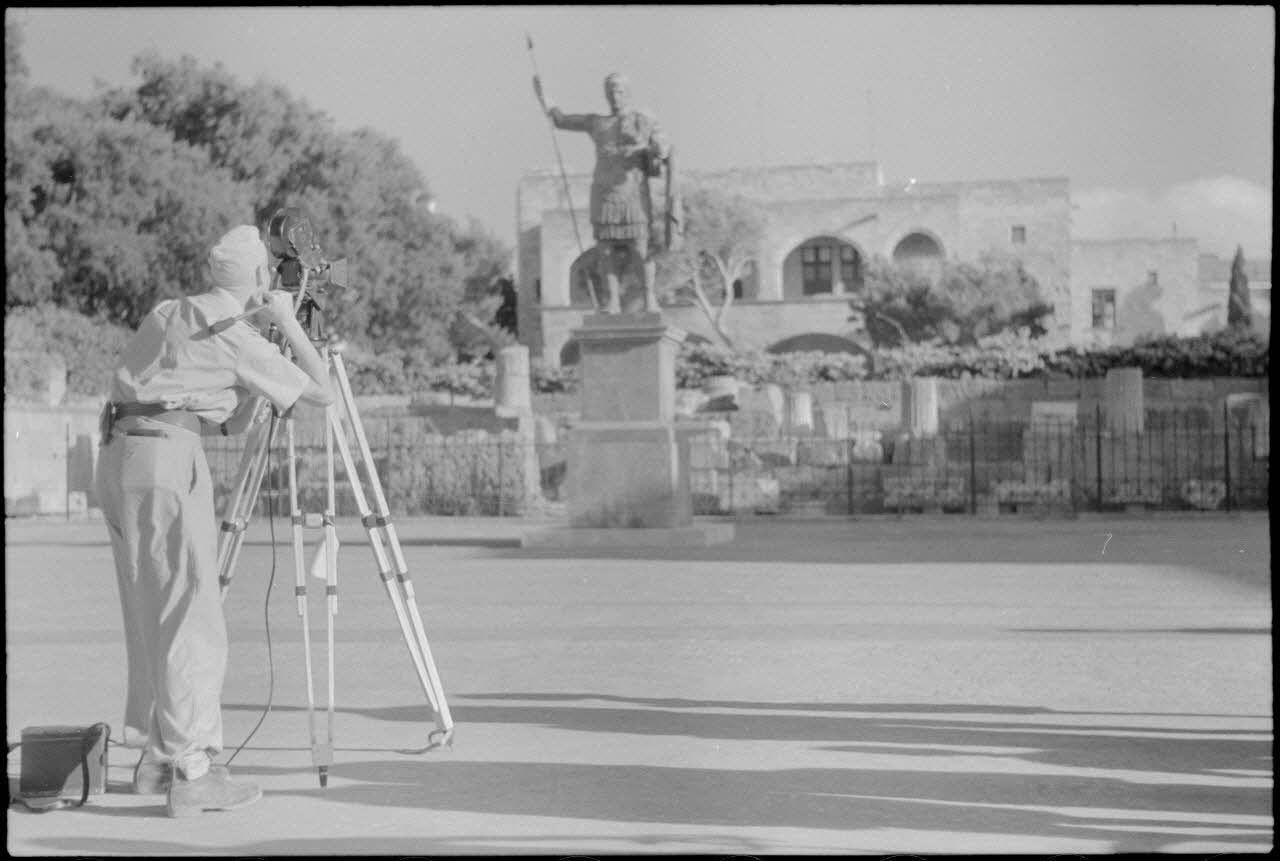 Le caméraman Hermann Dressler filme la ville de Rhodes à l'aide d'une Arriflex.