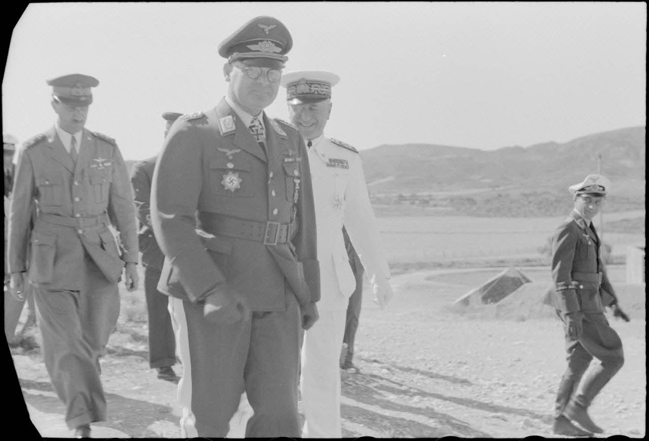 L'amiral italien Inigo Campioni guide son invité le général Martin Fiebig lors de son inspection des positions allemandes du Mont Filérimos.<br>