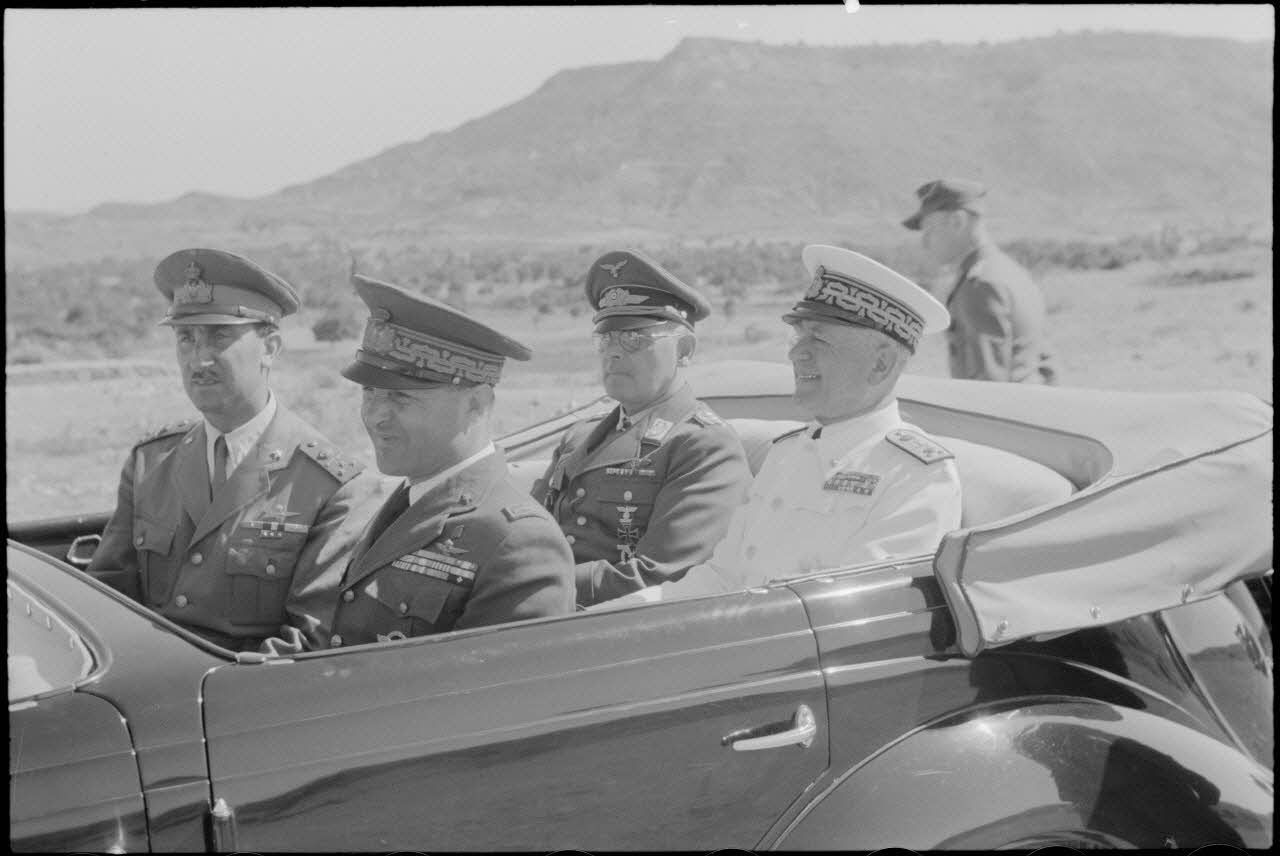 L'amiral italien Inigo Campioni guide son invité le général Martin Fiebig lors de son inspection des positions allemandes du Mont Filérimos.<br>