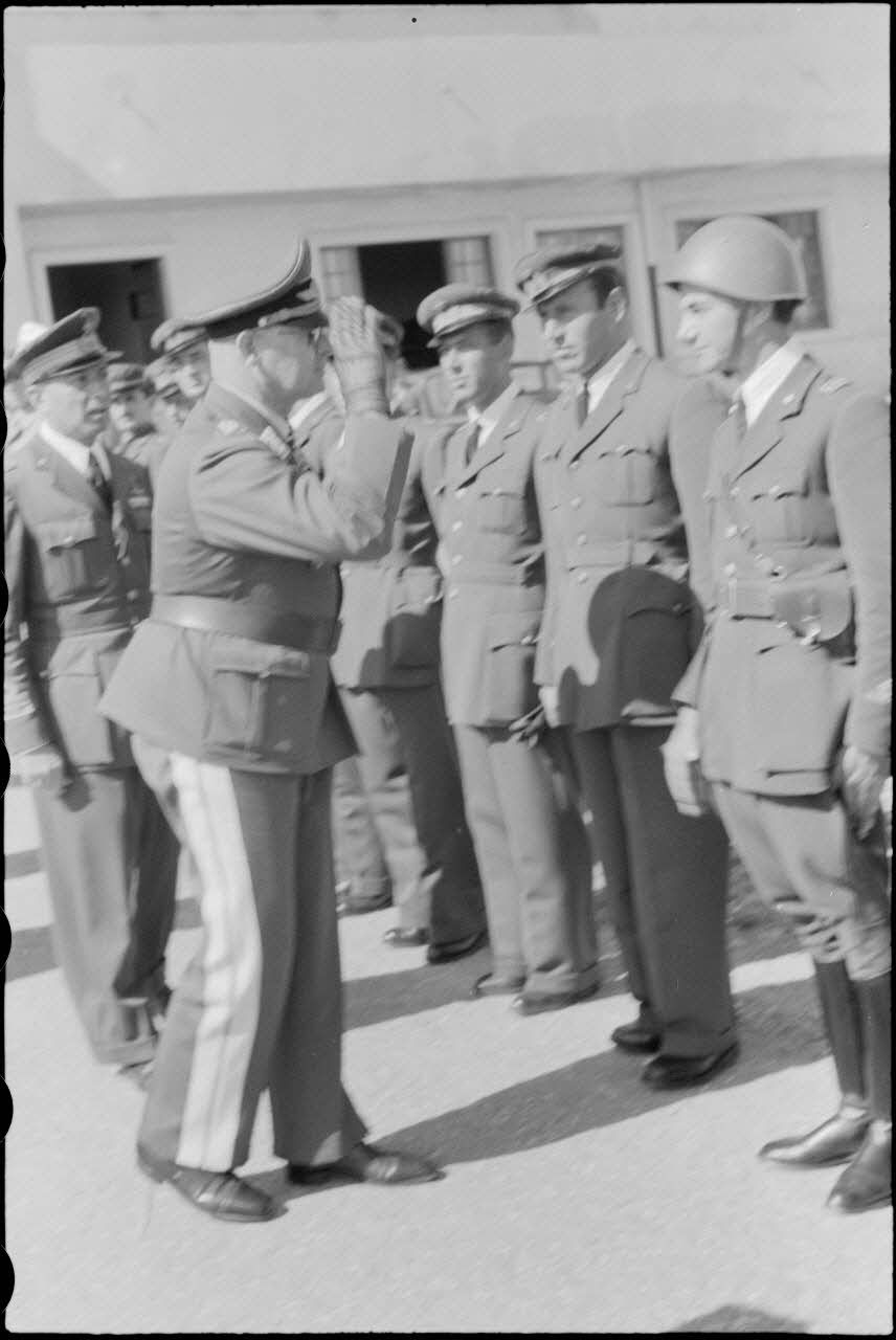 Le général (Generalleutnant) Martin Fiebig, commandant du X.Flieger Korps entame une tournée d'inspection sur l'île de Rhodes. Descente d'avion du général Fiebig sur le terrain d'aviation de Maritsa. Accueil de l'amiral italien Inigo Campioni (Agais Admiral dans la légende), le général (Generalleutnant) Kleemann, commandant les troupes d'assaut allemande sur Rhodes, et le général de division Briganti, commandant des forces aériennes italiennes dans le secteur (Befehlshaber der italien Luftstreikrafte in der Agais). Fiebig passe en revue une compagnie d'honneur italienne. Une Fiat 2800 CMC (Corta Militare Coloniale) à carrosserie spéciale (écusson) de l'armée italienne (LFT SO F2164 L26 et L38 et L39).