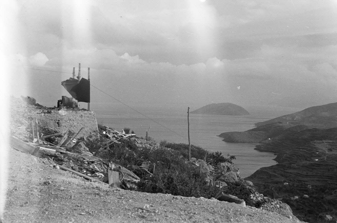 Sur l'ile de Leros (Grèce), peu après l'opération Taifun, le mont Meraviglia (aujourd'hui Platanos) et son château médieval.