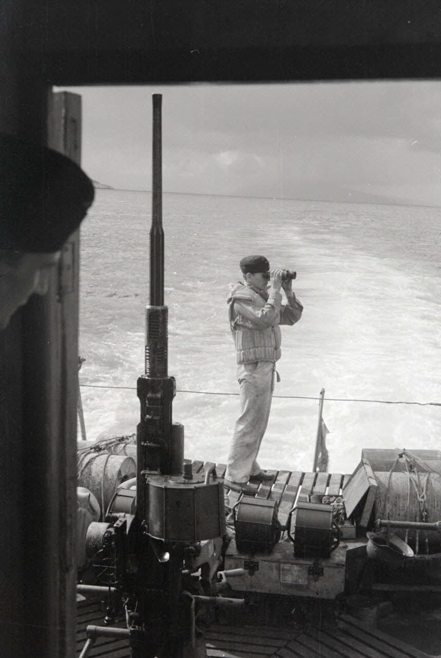 A l'approche de l'île de Samos, sur le pont d'un Raumboot de la Kriegsmarine.