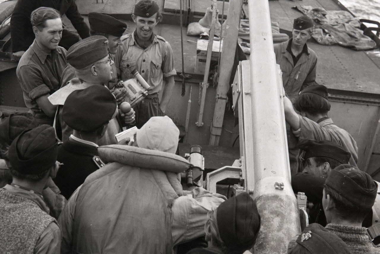 Suite à l'opération Taifun (invasion de l'île grecque de Leros), à l'aide de son micro, un officier de la compagnie de propagande réalise un reportage sur le pont d'un navire de la Kriegsmarine.