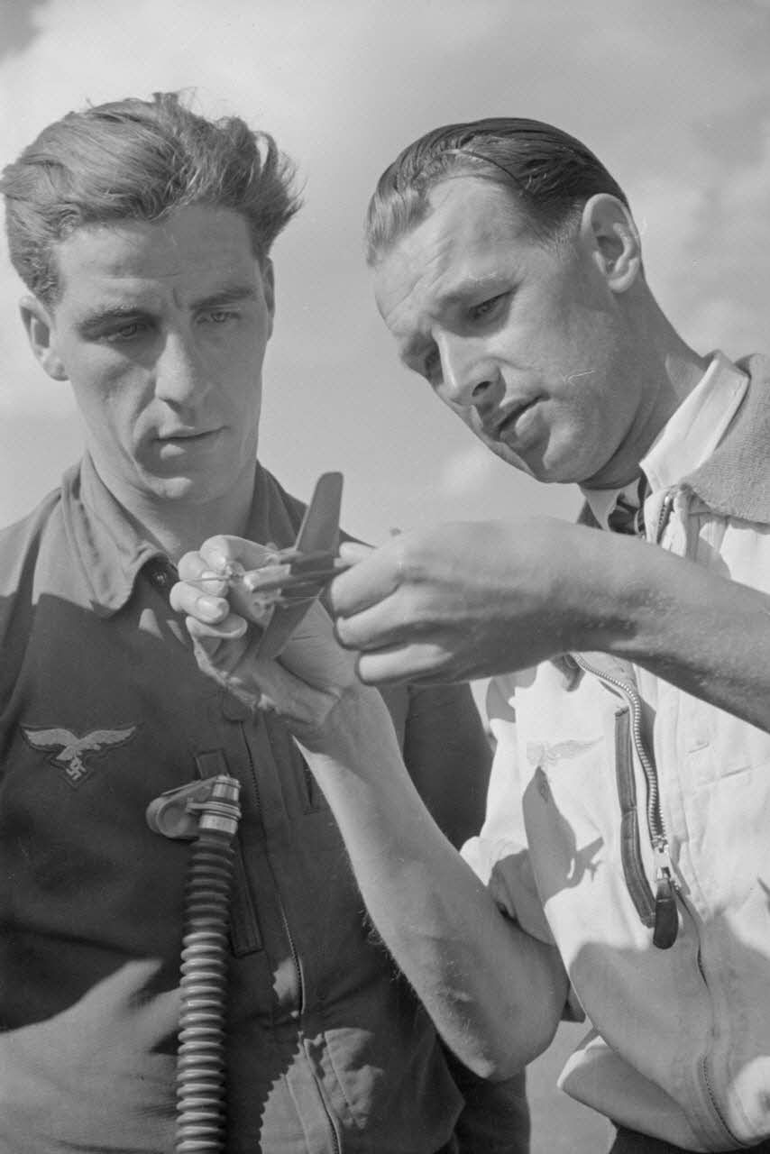 Georg Schentke et Eberhard von Boremski, récemment nommés instructeurs au sein de l'unité de formation, posent pour le reporter. Les mécaniciens de l'unité sont également à l'honneur, on remarque les chasseurs Messerschmitt Bf-109 F qui équipent l'unité. L'Oberfeldwebel prend place à bord d'un chasseur et entame la phase de décollage (DAA 2810 L22 à L26). Georg Schentke et Eberhard von Boremski évoquent un combat aérien, derrière eux et les élèves, les mécaniciens de l'unité effectuent la maintenance des appareils.