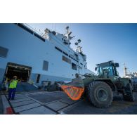 Un marin guide le chargement d'un bulldozer du…
