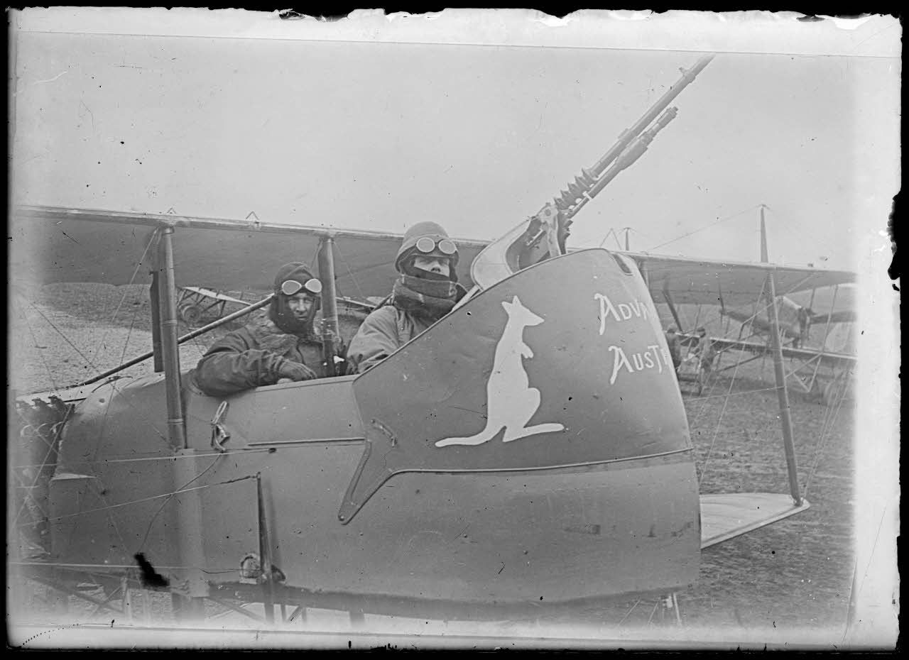 D169-8-1. Centre d’aviation de Toul. Capitaine Watt devant son appareil [Farman MF 11 Advance Australia dont le nez est orné d’un kangourou] avec le lieutenant Luc-Pupat. Tampon de la section photographique de l’armée au dos. Photographie de Jacques Agié réalisée entre le 29 février et le 7 mars 1916, référencée SPA 13 X 488, dans les fonds de l’ECPAD.