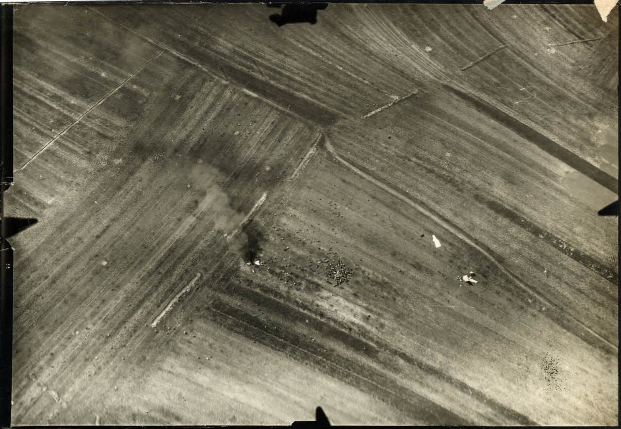[Photographie aérienne d'un avion en flamme et un avion qui s'est écrasé dans les champs].