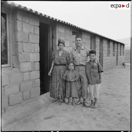 Un harki et sa famille devant son logement.