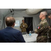 Un capitaine donne des consignes entouré de…