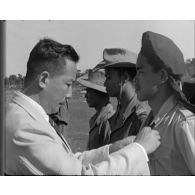 Arrivée du prince Savang et de Souvannah Phouma à l'aérodrome de Thakhek. Inspection des troupes et…