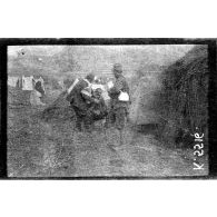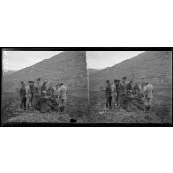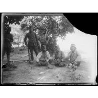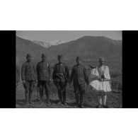 Près de Karaferia, un groupe de soldat français, albanais et un russe sont photographiés. Deux…