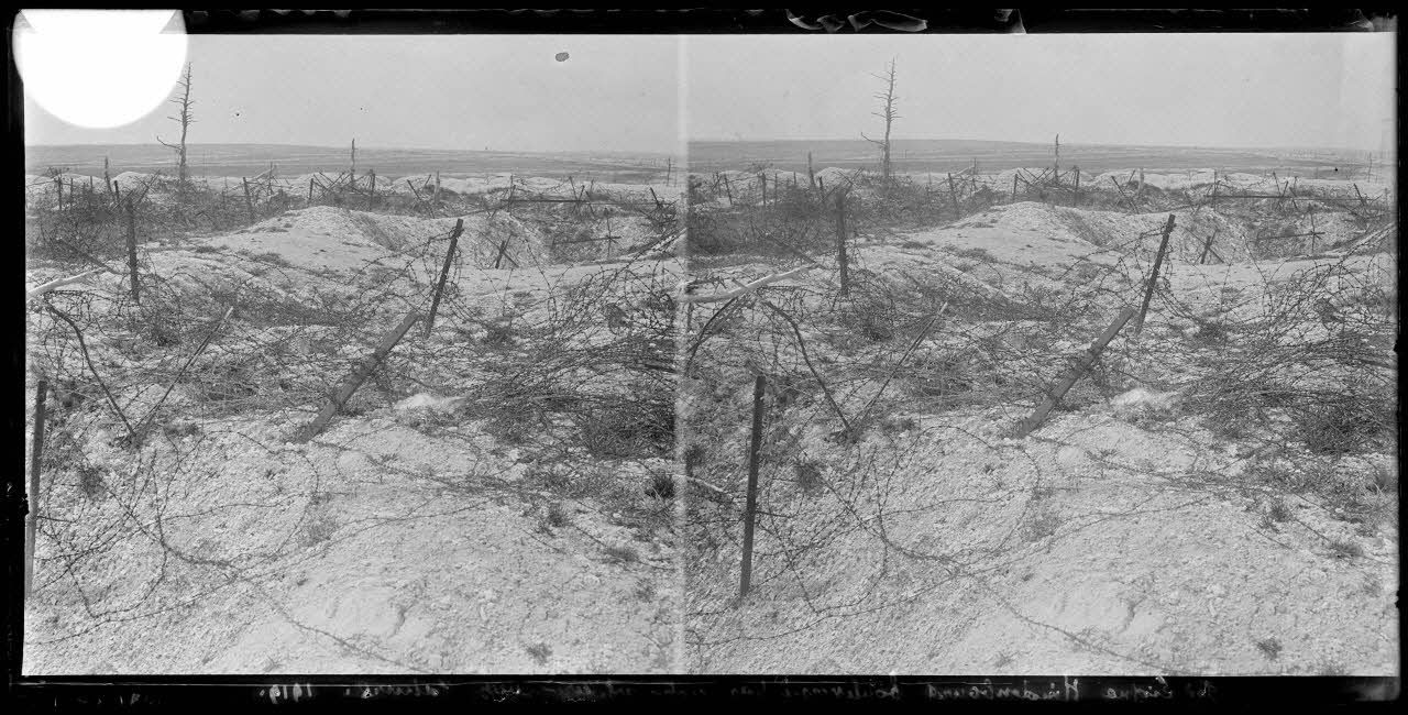 D193-2-991 Cimetière avec réseau de fils de fer boche, église de Thiescourt, Oise, 1917
