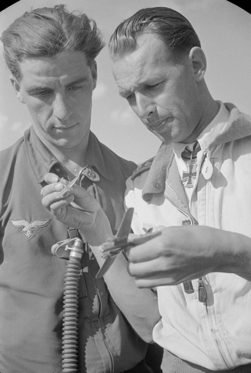 Note : Eberhard von Boremski obtient la croix de chevalier de la croix de fer (Ritterkreuz) le 03/05/1942, ce reportage se situe après cette date. Il pourrait s'agir de la date à laquelle Eberhard von Boremski et Georg Schentke sont nommés instructeurs au sein du Ergänzungsgruppe Süd. Ils retournent tous les deux au Jagdgeschwader 3 (JG 3) courant 1943. Georg Schentke est muté au Flugzeugführer 9. / Jagdgeschwader 3, le 24 septembre, il est décoré de la croix allemande en or (qui ne porte pas dans ce reportage), il meurt le 25 décembre 1942 à Pitomnik/Oblast Stalingrad.