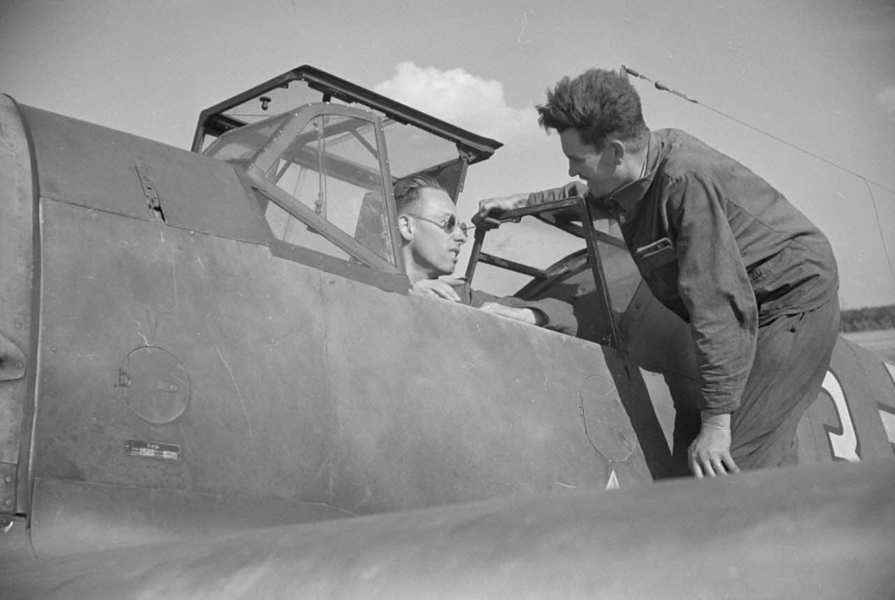 Alors que le moteur du Messerschmitt Bf-109 tourne déjà, le sous-officier Eberhard von Boremski, instructeur du Ergänzungsgruppe Süd, conseille un pilote.