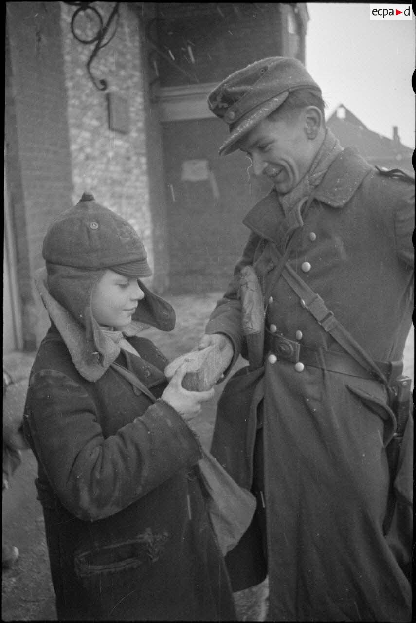 Sur une place de Vitebsk (Witebsk), la circulation est assurée par Feldgendarme, on reconnaît sa plaque hausse-col. Des femmes issues de la minorité allemande, ou qui travaillent pour l'occupant, sourient au photographe qui les immortalise. A la gare de Vitebsk (Witebsk), des permissionnaires de retour de leur foyer vont rejoindre leur garnison. Les soldats déposent leur paquetage sur un traineau pour en faciliter le transport. Les traineaux sont tractés par des enfants qui échangent leur service contre du pain ou des cigarettes.