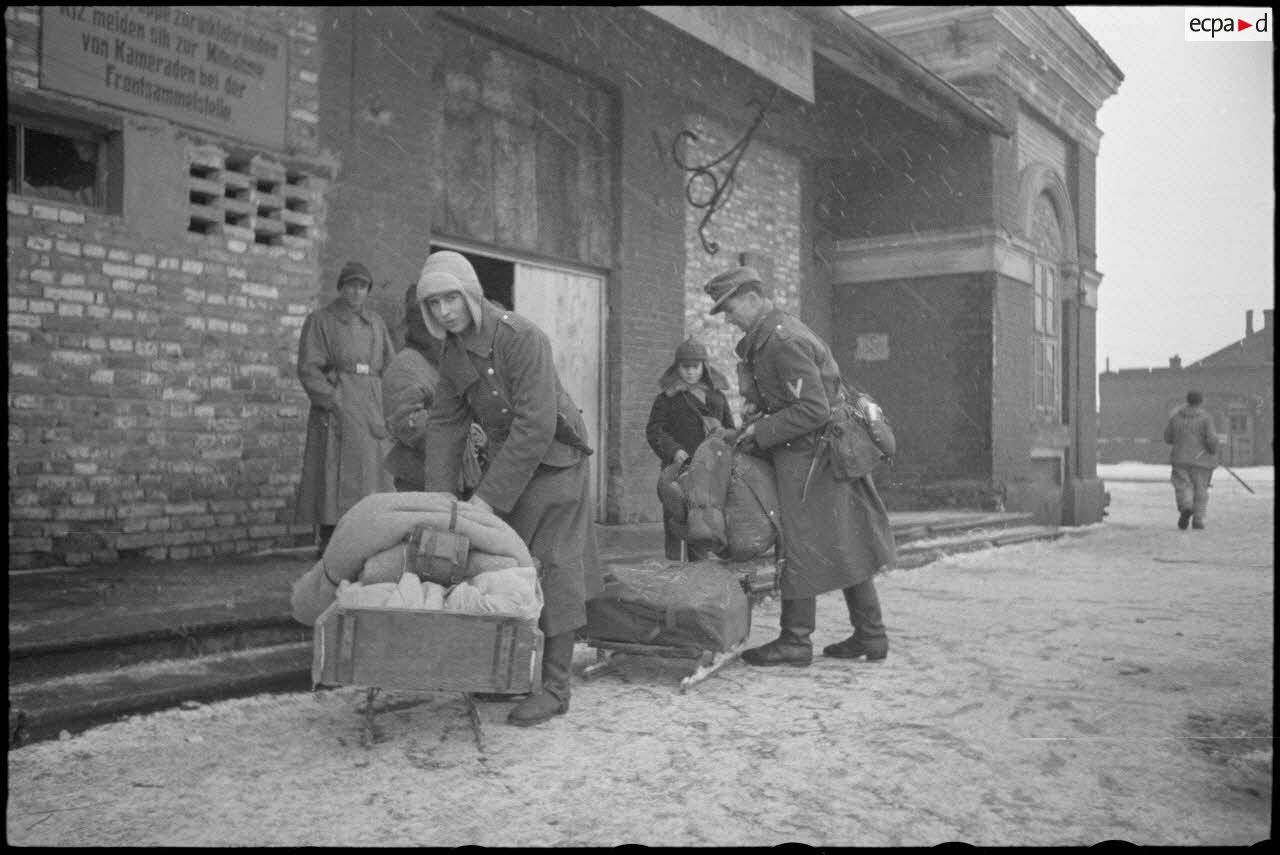 A Vitebsk (Witebsk), des permissionnaires allemands rejoignent leur affectation, un enfant tracte un traineau sur lequel sont installés l'équipement des fantassins.