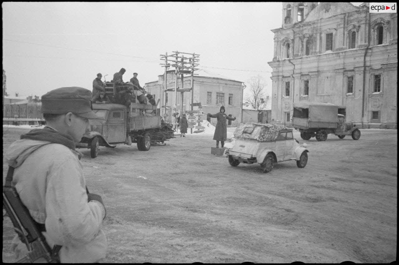 Sur une place de Vitebsk (Witebsk), la circulation est assurée par Feldgendarme, on reconnaît sa plaque hausse-col. Des femmes issues de la minorité allemande, ou qui travaillent pour l'occupant, sourient au photographe qui les immortalise. A la gare de Vitebsk (Witebsk), des permissionnaires de retour de leur foyer vont rejoindre leur garnison. Les soldats déposent leur paquetage sur un traineau pour en faciliter le transport. Les traineaux sont tractés par des enfants qui échangent leur service contre du pain ou des cigarettes.