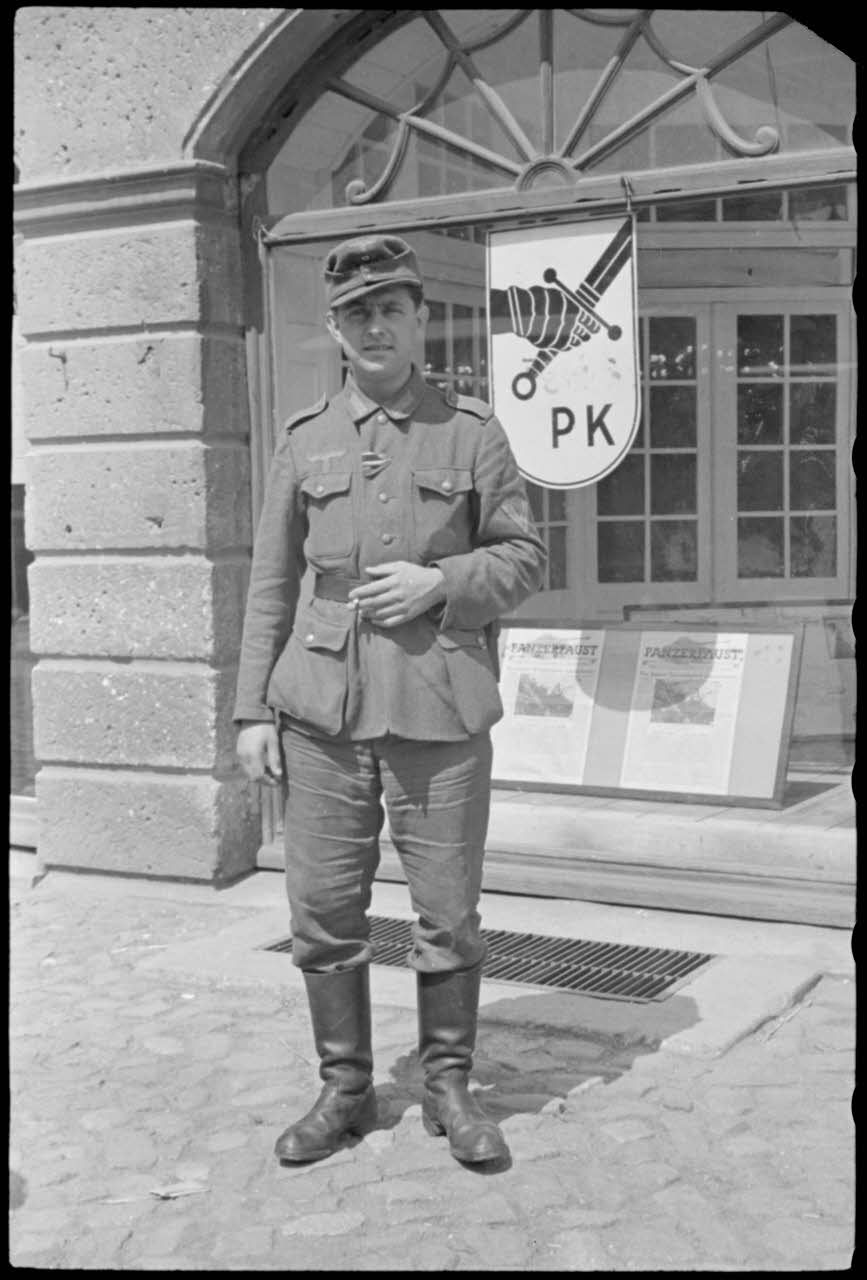 Hindenburgstrasse à Eydtkau (Eydtkuhnen) en Prusse-Orientale (Ostpreußen), un reporter de la Pk.697 devant les bureaux du journal de propagande intitulé Panzerfaust.