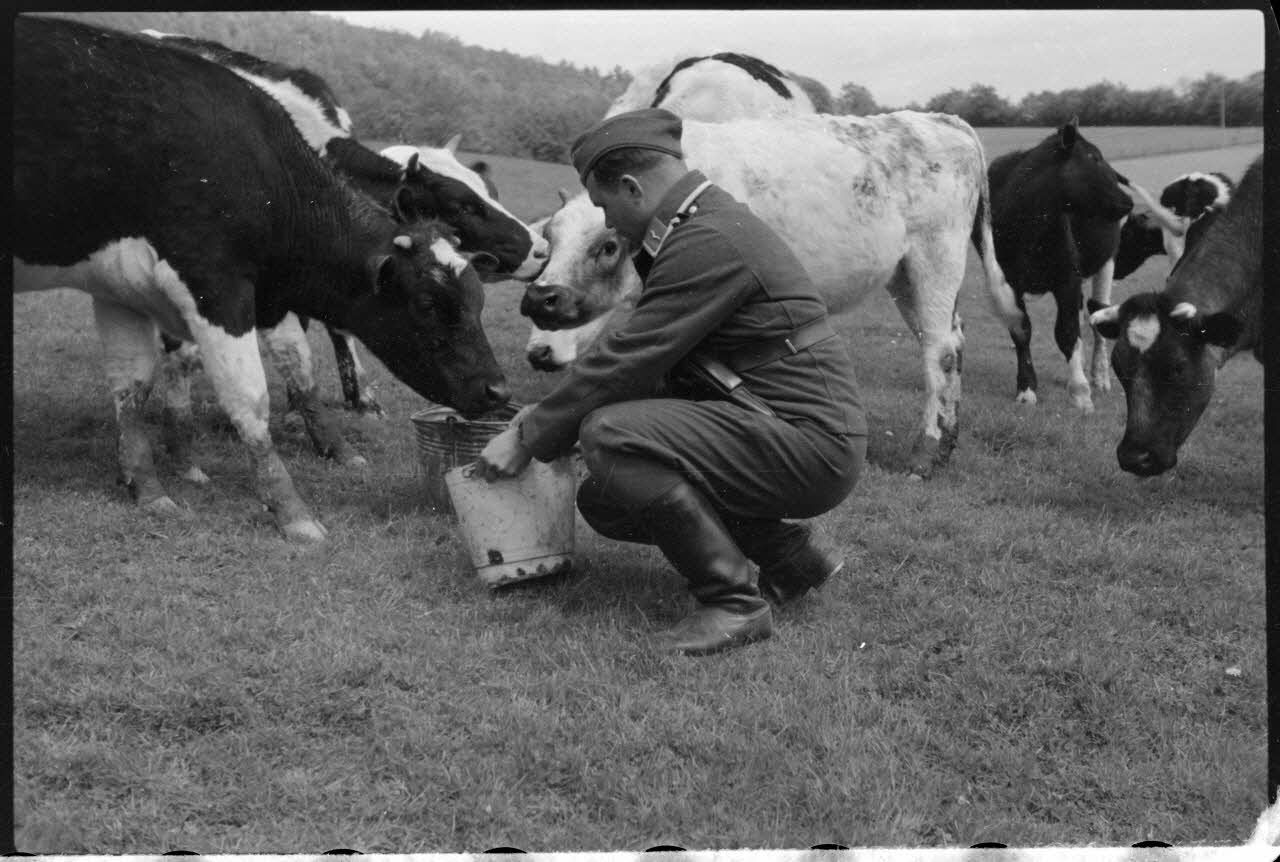 Traite d'une vache par des membres de la même compagnie de propagande, on reconnaît notamment le caméraman Hans Theyer. Le reporter porte le grade de Sonderführer (G pour Gruppenführer), grade équivalent à sous-officier. Convois allemands sur une route de Belgique.