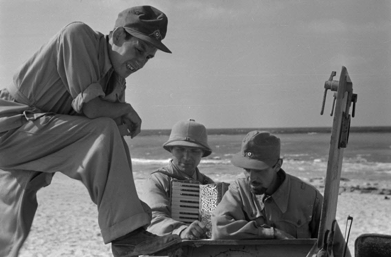 Sur une plage d'Egypte (El Quasaba), des membres de la KDF (Kraft durch Freude) jouent de la musique et chantent.