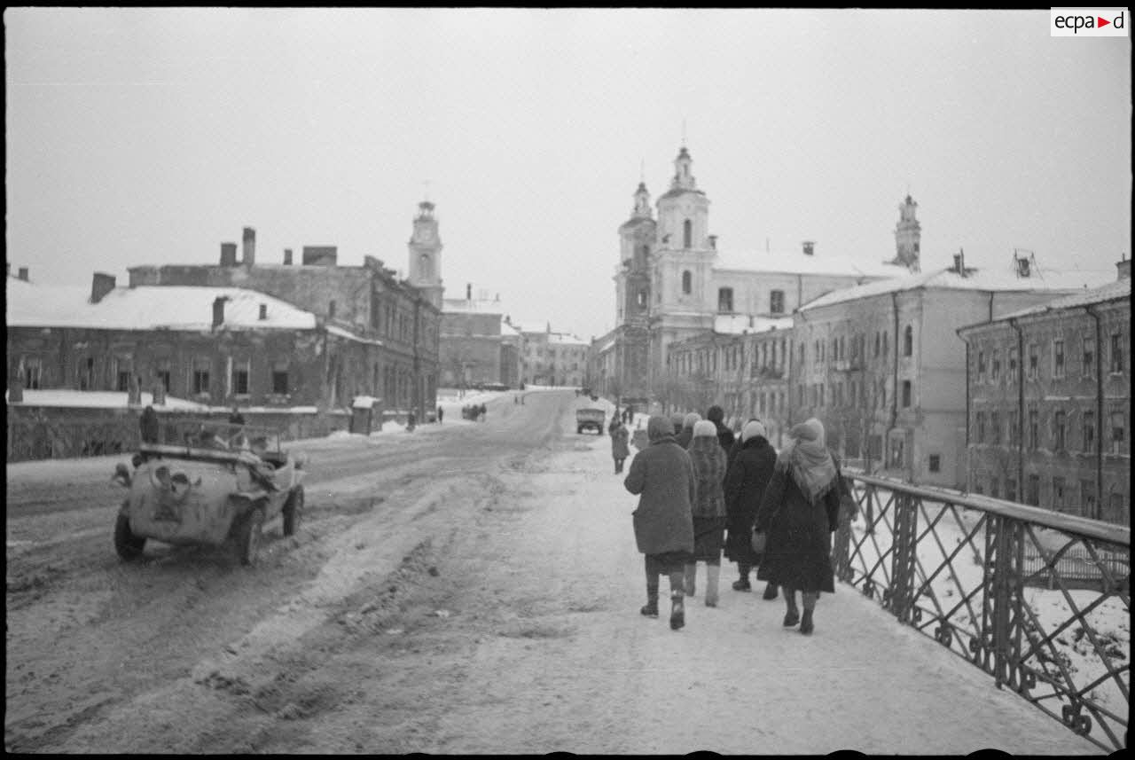 Sur une place de Vitebsk (Witebsk), la circulation est assurée par Feldgendarme, on reconnaît sa plaque hausse-col. Des femmes issues de la minorité allemande, ou qui travaillent pour l'occupant, sourient au photographe qui les immortalise. A la gare de Vitebsk (Witebsk), des permissionnaires de retour de leur foyer vont rejoindre leur garnison. Les soldats déposent leur paquetage sur un traineau pour en faciliter le transport. Les traineaux sont tractés par des enfants qui échangent leur service contre du pain ou des cigarettes.